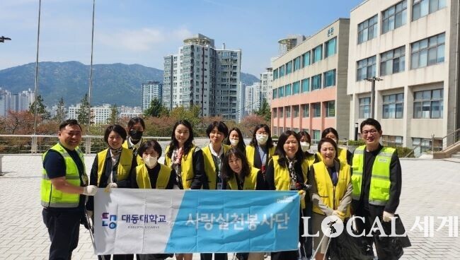 ▲대동대학교 전경. 사랑실천봉사단원들이 대운동장에 집결, 기념촬영을 하고 있다. 대동대 홈페이지 캡처 |