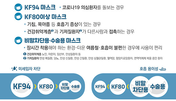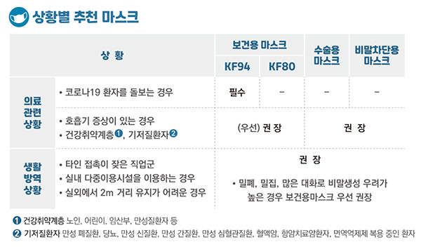 특히 밀폐, 밀집, 많은 대화 등으로 비말 생성 가능성이 큰 경우 KF80 이상의 보건용 마스크를 권장하며, 더운 여름철이나 마스크를 장시간 착용해야 하는 환경, 호흡이 불편한 경우는 가볍고 통기성이 좋은 마스크를 착용하는 것이 더 편리하다.