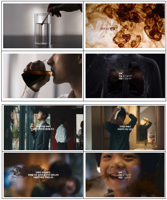 담배 한 개비를 깨끗한 물이 담긴 컵에 넣었을 때 물 색깔이 유해성분으로 검붉게 퍼져나가며 오염되는 모습을 보여준 후 그 물을 마시는 사람의 모습이 흡연하는 모습으로 바뀌는 반전 장면이 연출된다.