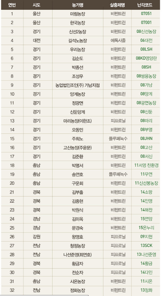 정부가 지난 15일부터 17일까지 전국 산란계 농장 살충제 전수조사결과 계란 유통이 금지된 농장 32곳으로 늘어났다.