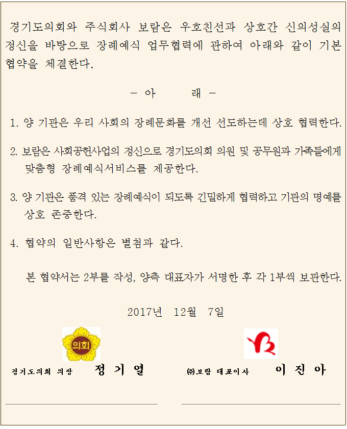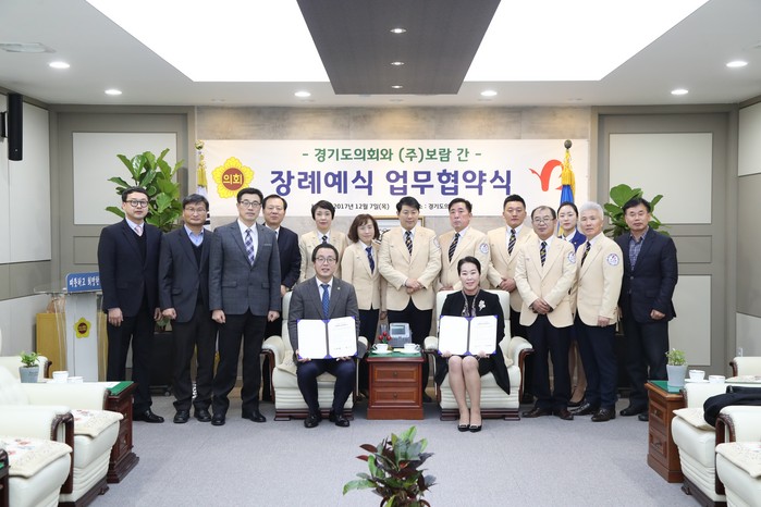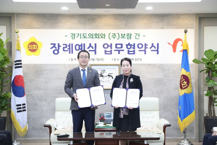이번 업무협약은 경기도의회와 ㈜보람 간의 우호 친선과 신의성실의 정신을 바탕으로 품격 있는 장례예식이 되도록 긴밀한 협력관계 구축과 우리 사회의 장례문화를 개선 선도하는데 있다고 밝혔다.