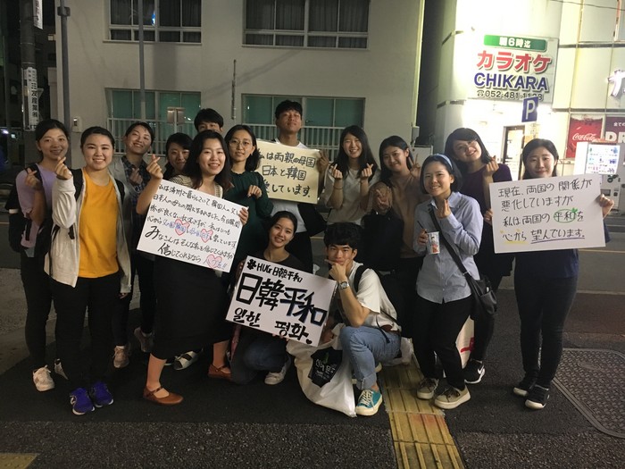 ▲7일 일본 나고야역 앞에서 한국과 일본의 청년들이 일본 시민들에게 한일평화를 외치며 ‘프리허그’ 캠페인을 진행하고 있다. |