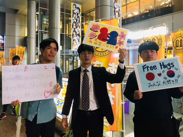 ‘프리허그’는 한일 청년들이 한 조를 이뤄 “우리는 한국과 일본을 사랑한다”는 메시지가 적힌 피켓을 들고 일본 시민들에게 허그(hug)를 제안하는 방식으로 진행됐다.