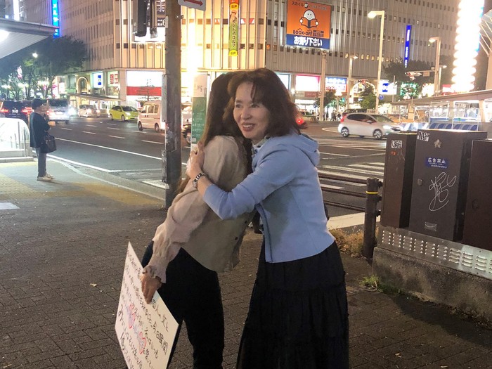 ▲8일 일본 도쿄에서 청년ngo ‘한일국적자들’ 회원들이 한일평화를 메시지로 한 시민과 ‘프리허그’을 하고 있다. |