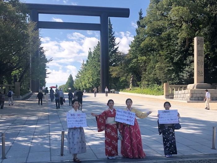 이번 캠페인은 7일 나고야역을 시작으로 9일에는 일본 우익의 상징인 도쿄 야스쿠니 신사 앞에서 진행됐다.