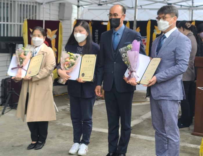 ▲이창우 부산북구장애인협회장이 유공자들에게 표창장을 수여한 뒤 기념촬영을 하고 있다. |