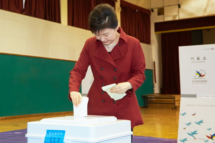 ▲박근혜 대통령이 13일 서울 종로구 청운효자동 제1투표소에서 제20대 국회의원 총선거 투표를 하고 있다. 청와대 제공. |