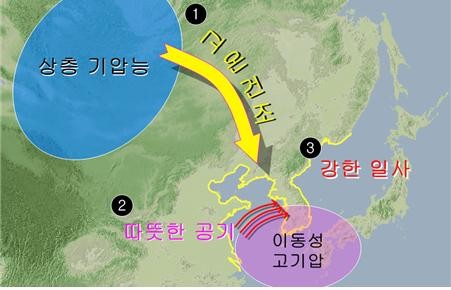 이번 더위는 ①중국 북부 대기 중·상층에 위치한 고온건조한 공기가 우리나라 부근으로 이동·하강하면서 공기의 온도가 상승하고 ②장시간 한반도 주변에 이동성고기압이 머물면서 대기 하층으로도 따뜻한 남서풍이 기속적으로 불어들었으며 ③맑은 날씨가 주말동안 지속되면서 일사로 인한 지면가열이 매우 활발했기 때문이다.