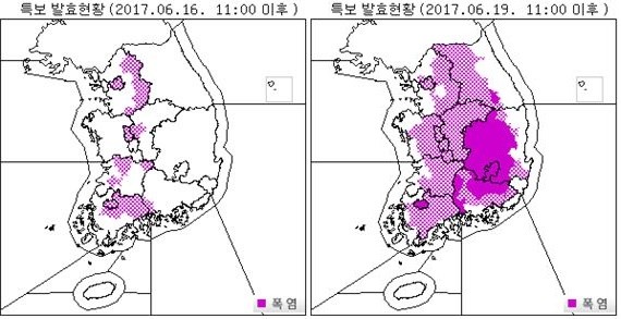 ▲ 6월 16일(금) 폭염특보 현황6월 19일(월) 폭염특보 현황(16시 현재) |