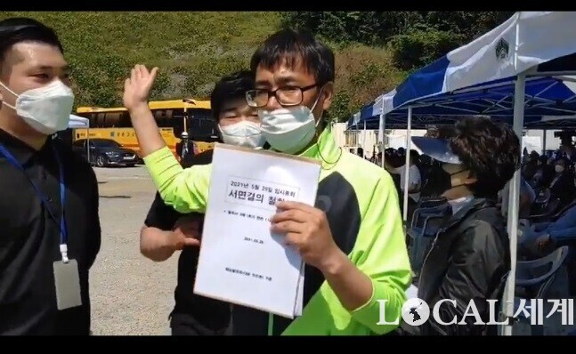▲ 2021년 5월 백운포 소재 주차장에서 비상대책위 주관 아래 열리고 있는 감만1구역재개발조합 임시총회장에서 현 조영진 사무장이 서면결의 철회서를 들어 보이며, "이 임시총회가 의결정족수를 충족하지 못한 채 개회한 불법으로 진행되는 불법해임총회다", "어제 합당한 방식으로 서면결의 철회서를 비대위 사무실에 전달하려 했으나 거부당해 오늘 임총장에 직접 철회서를 가져와 현장에서 접수하겠다. 상당수 서면결의서가 조합원 당사자 몰래 위조된 것을 발견했다"라고 언론에 설명하고 있다. 로컬세계 자료사진 |