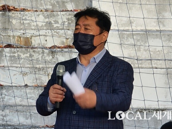▲ 2021년 10월 옛 부산외국어대 운동장에서 진행된 감만1구역재개발조합 임시총회 때 김경래 조합장이 "비대위측의 분탕질과 위법행위로 인해 조합 사업일정이 지연돼 엄청난 손해가 발생하고 있으며, 범법자들에 대해 끝까지 책임을 묻겠다"라며 격하게 비난하는 발언을 하고 있다. 로컬세계 자료사진 |