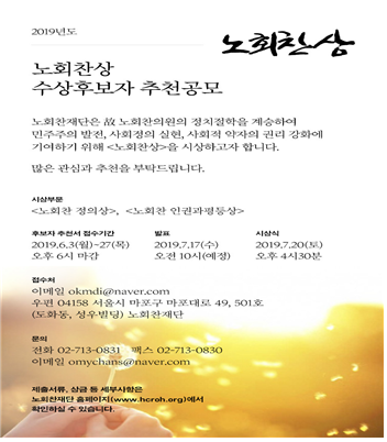 [로컬세계 김순복 기자]평등하고 공정한 나라 노회찬재단(이사장 조돈문)은 지난 28일부터 ‘2019년도 노회찬상 수상후보자 추천공모’를 시작했다.