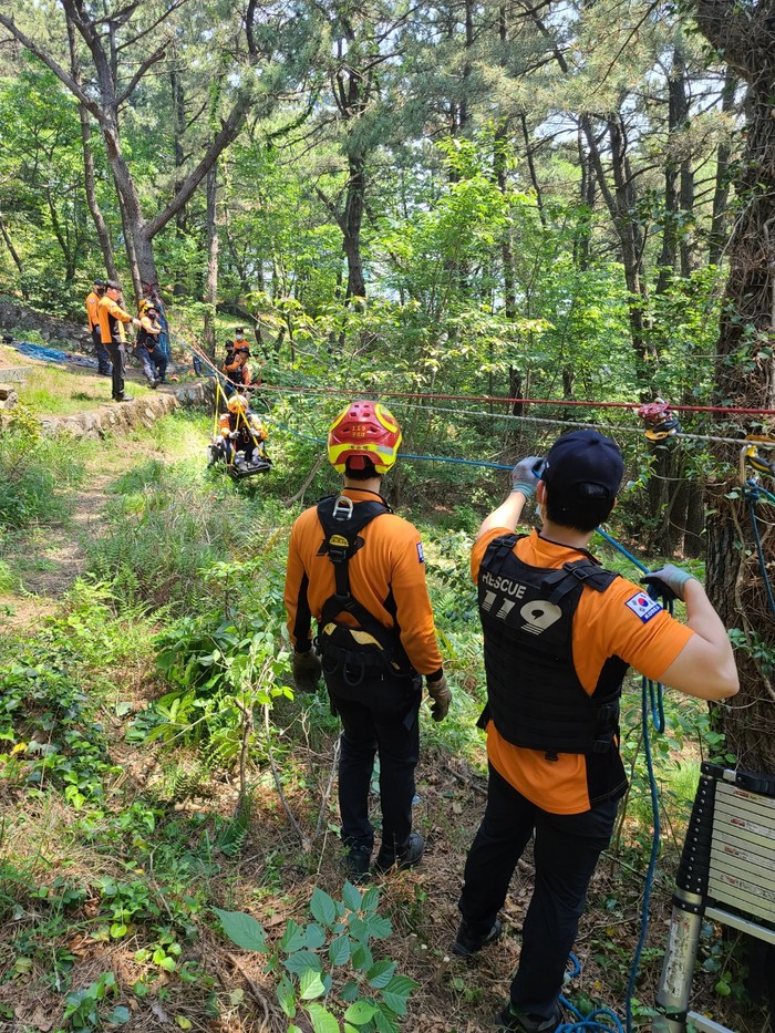 주요 내용은 ▲관내 봉래산 주요 등산로 및 긴급구조위치표지판 확인 ▲인명구조기술(수평, 수직, 도하 구조방법 등) ▲산사태 등으로 인한 추락 고립 시 구조대상자 구출 훈련 등이며, 산악안전지킴이 캠페인도 병행 실시했다.