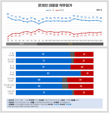 문재인 대통령 직무수행 긍정률은 지방선거 직전인 6월 2주차(6. 9~10) 대비 3%p 하락한 69%, 부정률은 3%p 오른 27%로, 남북정상회담 전인 4월 2주차(잘함 69% vs 잘못함 27%) 수준과 유사한 것으로 나타났다.