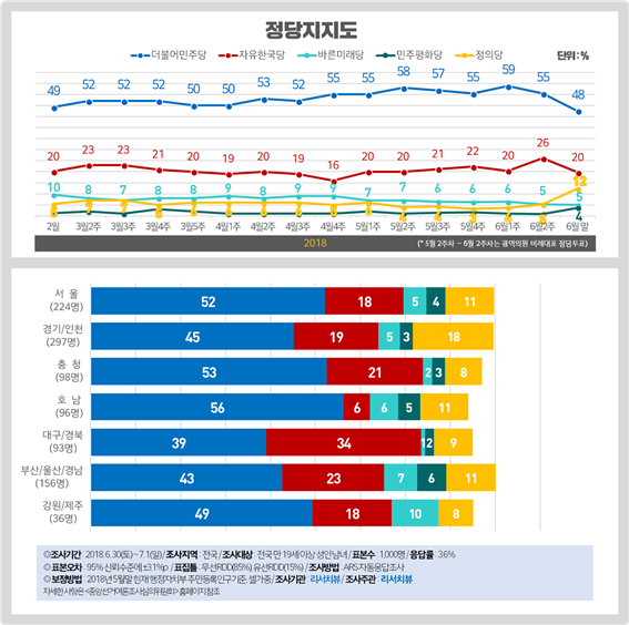 정당지지도 역시 민주당은 6월 2주차 대비 7%p 급락한 48%로 지난 1월말(47%) 이후 최저치를 기록한 반면, 정의당은 7%p 급등한 12%로 제19대 대선 이후 최고치를 경신했다.