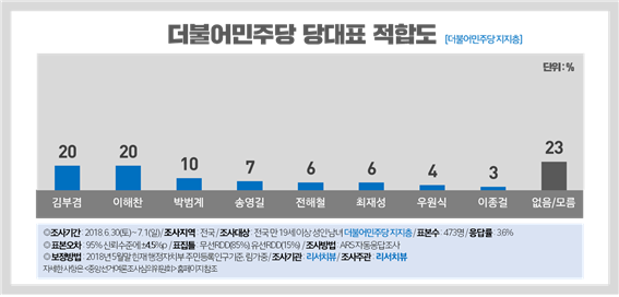 더불어민주당이 오는 8월 25일 전당대회에서 새 지도부를 선출할 예정인 가운데 민주당 지지층(n : 473명)을 대상으로 한 차기 당대표 적합도는 김부겸 장관과 이해찬 의원이 나란히 20%의 지지를 얻어 팽팽한 접전을 펼쳤다. 뒤를 이어 ▲박범계(10%) ▲송영길(7%) ▲전해철(6%) ▲최재성(6%) ▲우원식(4%) ▲이종걸(3%)순으로 나타났다(없음/모름 : 23%).