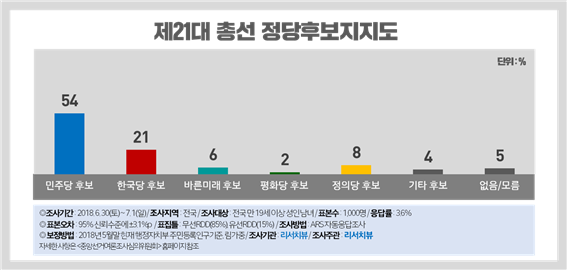 제21대 총선을 가정한 정당후보 지지도는 54%의 지지를 얻은 민주당이 21%에 그친 한국당을 2.6배가량인 33%p차로 압도하는 가운데 ▲정의당(8%) ▲바른미래당(6%) ▲민주평화당(2%)순으로 뒤를 이었다(기타 후보 : 4%, 무응답 : 5%).