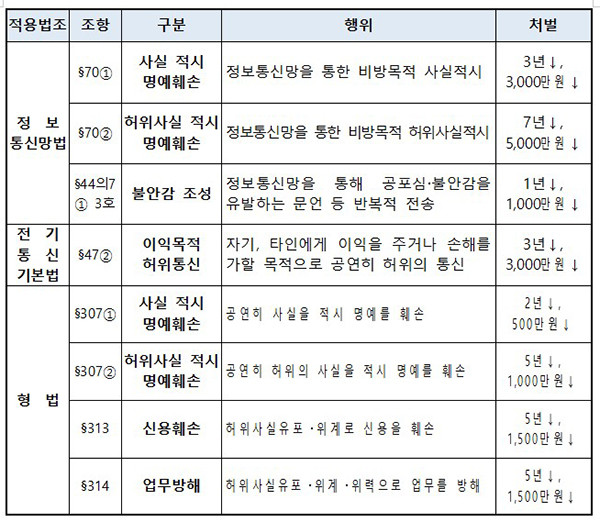 ▲허위사실 유포 관련 주요 처벌 규정. |
