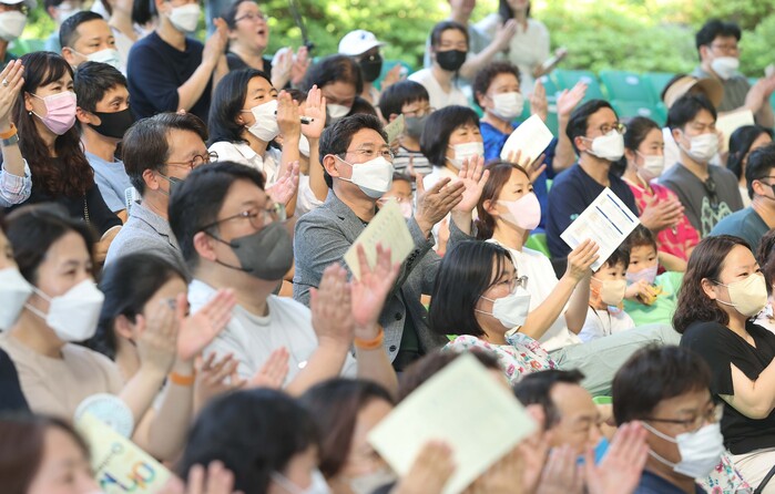 ▲시민들과 함께 꿈의 오케스트라 '용인'의 연주를 들으며 박수를 치고 있는 이상일 용인시장. |