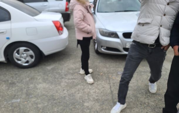 ▲3사공동취재팀 소속 기자 2명은 지난달 14일 오후 3시쯤 김종원 대표를 만나기 위해 승용차 편으로 부산 강서구 생곡동 생곡재활용센터를 찾았다가 취재차량(사진 왼쪽)의 퇴로를 차단당한 채 “누구 마음대로 사진을 찍나, 여기가 니 안방이가… 대가리 깬다.”라는 등의 집단(특수) 협박을 당했다. 사진 속에만 3명이나 보인다. 3사 공동취재팀 |