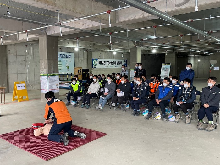 주요 교육내용은 ▲화재의 위험성 이해 ▲공사장 화재사례 소개 ▲대피시 행동방법 ▲초기진화 방법 ▲올바른 심폐소생술 방법 ▲환자발생 대비 응급처치법 등으로 해당 내용의 설명과 함께 실습을 통해 쉽게 이해할 수 있도록 진행했다.