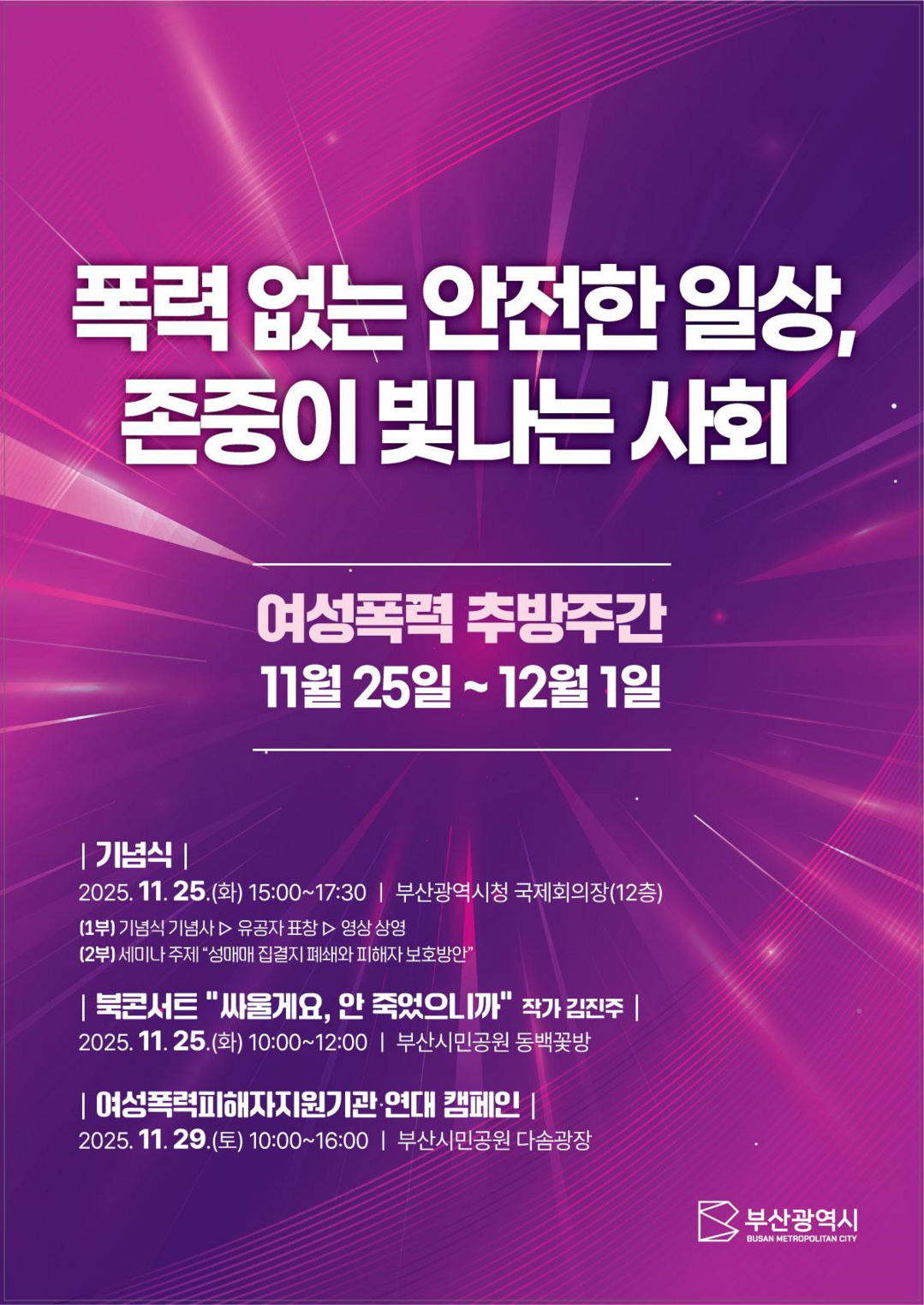 이와 함께 부산시는 여성폭력 피해 지원기관과 협력해 다양한 행사와 홍보활동을 펼친다. 25일 오전 10시에는 부산시민공원 동백꽃방에서 김진주 작가와 함께하는 북콘서트 ‘싸울게요, 안 죽었으니까’가 열린다. 전시회는 시청 지하통로(24~28일)와 시민공원 다솜갤러리(24~30일)에서 진행되며, 부산역·서면 일대 다중집합장소 10곳에서는 25일부터 27일까지 릴레이 캠페인이 펼쳐진다. 29일에는 시민공원에서 피해자 지원기관 연대 캠페인과 시민 참여형 홍보 부스도 운영된다.