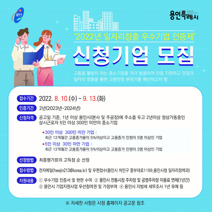 신청 대상은 1년 이상 용인에 본사 또는 공장 주소지를 둔 상시근로자 5인 이상 300인 미만의 중소기업으로 고용증가율 5% 이상이고 고용 증가 인원이 3~5명 이상인 기업이다. 단, 2년 이상 정상 운영 중이어야 한다.