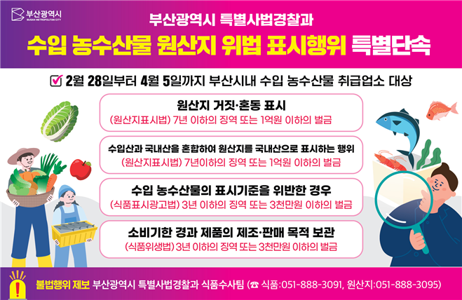 [로컬세계 부산=김민준 기자]부산시 특별사법경찰과(이하 특사경)는 28일부터 4월 5일까지 시내 수입 농수산물 취급 업소를 대상으로 원산지 둔갑행위 등 위법행위 특별단속을 벌인다고 밝혔다.