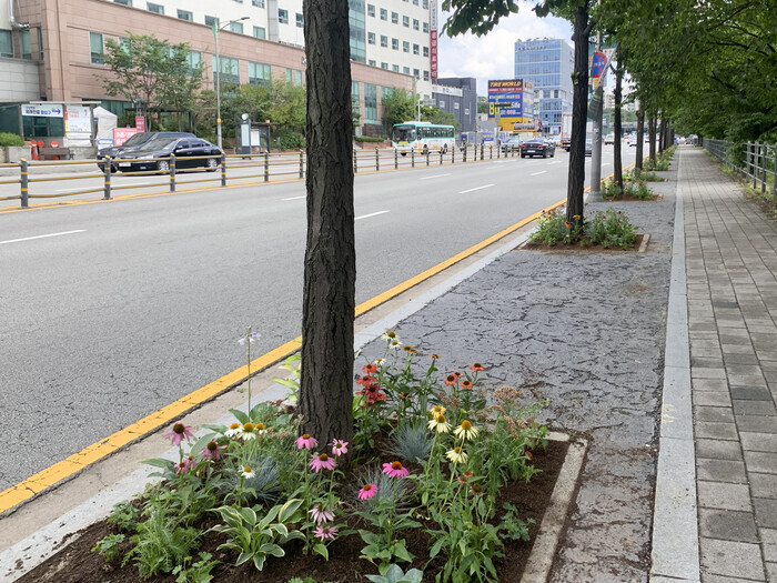 [로컬세계=김병민 기자]경기 용인시 기흥구가 아름다운 산책로를 만들기 위해 신갈오거리~기흥역사거리 200m 구간 가로수 주변에 시민이 직접 가꾼 꽃길을 조성했다.