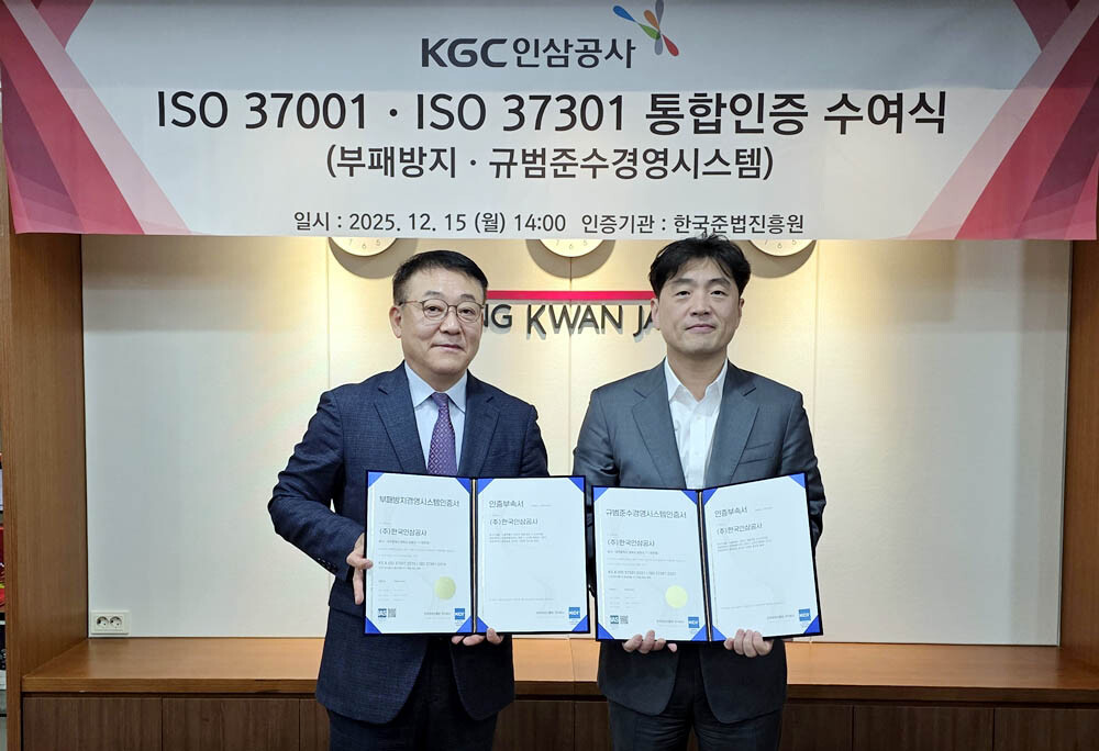 KGC인삼공사는 국제표준화기구 인증 기관인 한국준법진흥원으로부터 규범준수경영시스템(ISO 37301)과 부패방지경영시스템(ISO 37001) 통합인증을 획득했다고 16일 밝혔다.