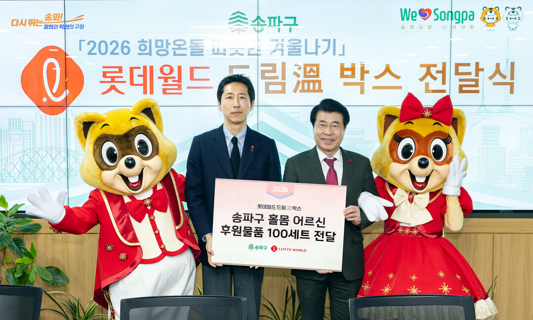 <드림溫(온)박스> 전달식 기념사진 촬영하는 롯데월드 이경호 경영지원부문장과 서강석 송파구청장(왼쪽부터)