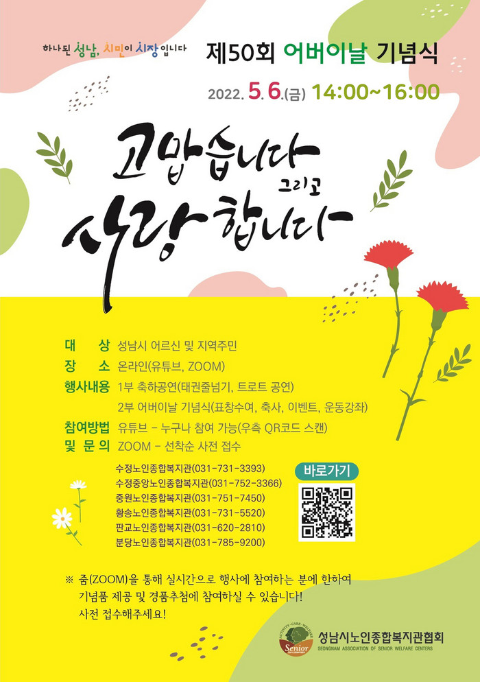 성남시노인종합복지관협회(회장 김진권)가 주관하는 이날 행사는 수정중앙노인종합복지관 유튜브로 생방송 해 시민 누구나 시청할 수 있다.