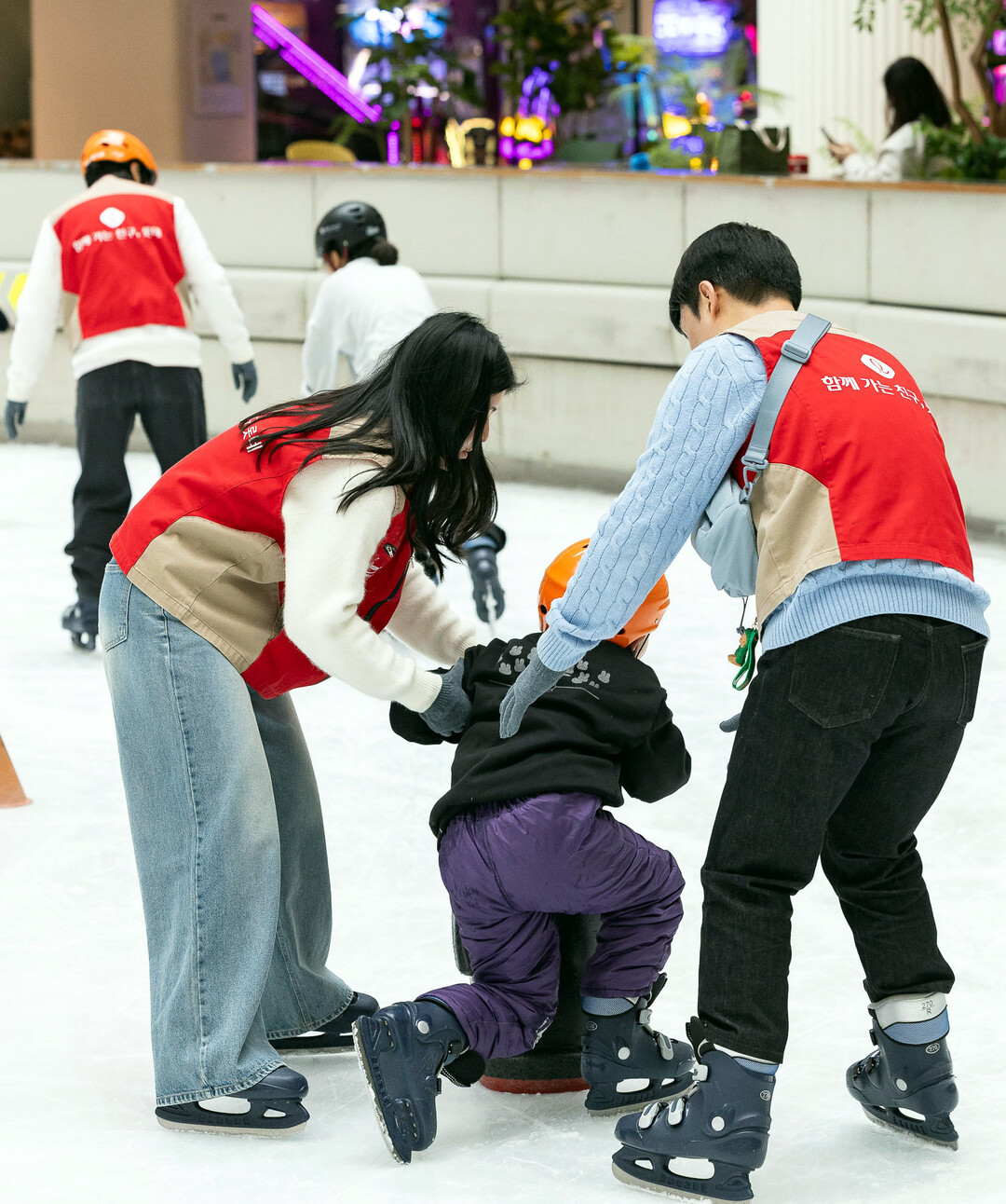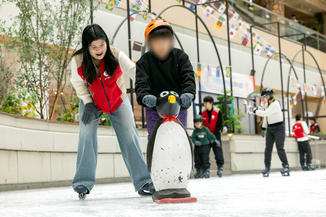 샤롯데 봉사단과 함께 아이스스케이트 강습 중인 아동들.
