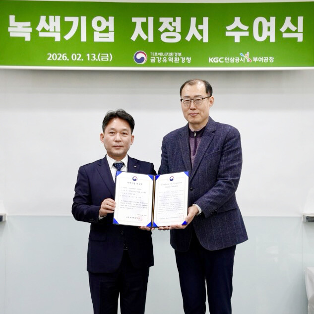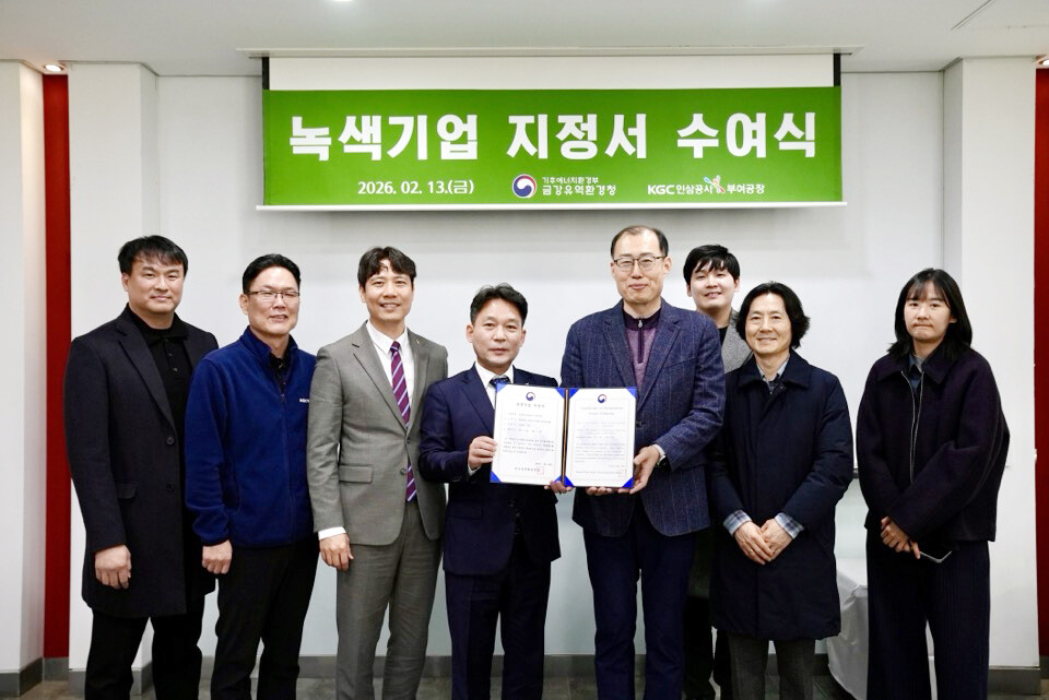[로컬세계 = 지차수 기자] KGC인삼공사 부여공장이 지난 1월 30일 금강유역환경청으로부터 녹색기업으로 선정됐다.지난 13일 오후 충남 부여군에 위치한 부여공장에서는 금강유역환경청과 함께 '신규 녹색기업 현판식'이 진행됐다.