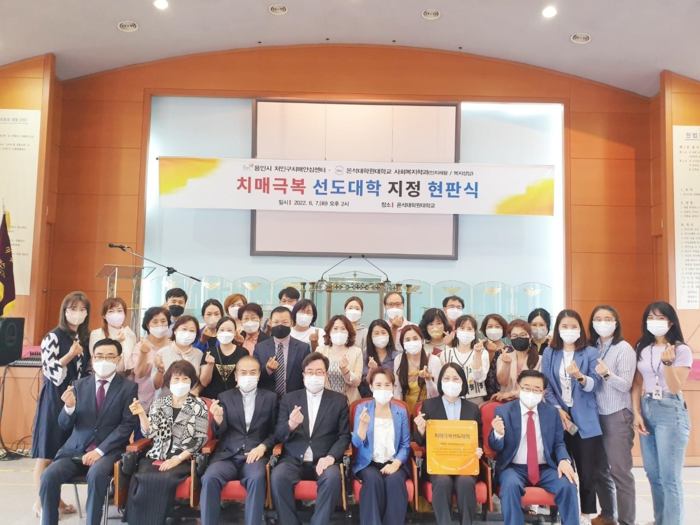 ▲처인구보건소 치매안심센터가 온석대학교대학원을 치매극복선도대학으로 지정하고 현판을 전달했다. 용인시 제공 |