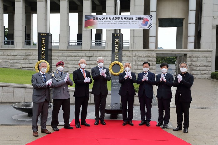 ▲15일 전쟁기념관 평화의 기념관에서 열린 ‘독일 6.25 전쟁 참전비 제막식’에 부영그룹 신명호 회장이 참석했다. 부영그룹은 이중근 회장이 2015년 6·25전쟁 당시 목숨 바쳐 우리를 도와준 참전 용사들에게 감사의 마음을 표현하고자 한국과 유엔, 참전국 21개국을 상징하는 기념비 23개를 제작해 기증한 공로로 오늘 제막식에 초청됐다. 기념비 좌측 두번째부터 신명호 부영그룹 회장, 미하엘 라이펜슈툴 주한 독일대사, 이상철 전쟁기념 사업회장. [부영그룹 제공] |