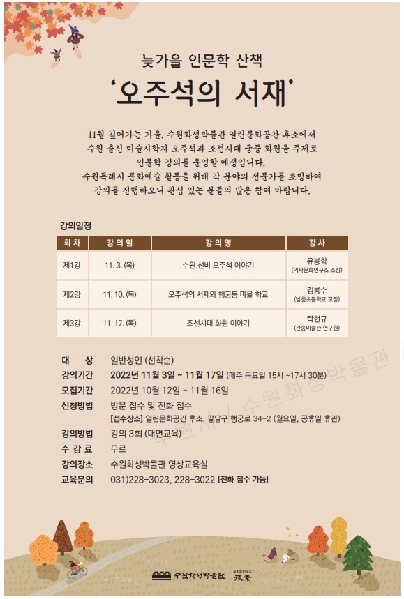 열린문화공간 후소는 11월 3일, 10일, 17일 3회에 걸쳐 오후 3시부터 5시 30분까지 수원화성박물관 영상교육실에서 ‘늦가을 인문학 산책-오주석의 서재’를 주제로 강의를 진행한다.