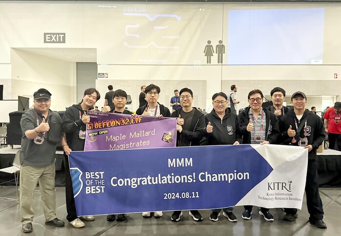 한국정보기술연구원(원장 유준상, 이하 KITRI)은 ‘차세대 보안리더 양성 프로그램(Best of the Best, 이하 BoB)' 멘토와 수료생을 중심으로 구성된 Maple Mallard Magistrates(이하 MMM)팀이 ‘2024년 데프콘 국제해킹방어대회(DEFCON CTF 32)’에서 우승을 차지했다고 12일 밝혔다.