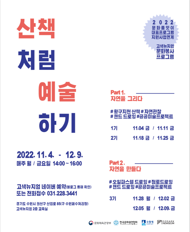 [로컬세계=김병민 기자]경기 수원시 고색뉴지엄이 오는 4일부터 2022 문화나눔 프로그램 ‘산책처럼 예술하기’를 운영한다.