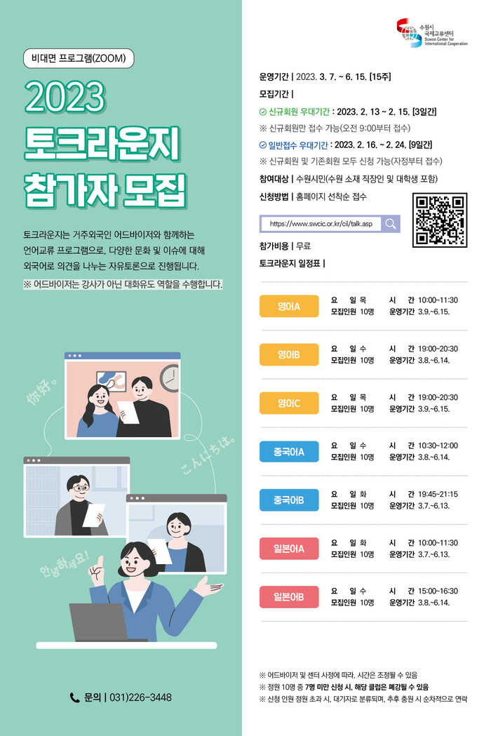 참여 신청은 수원시국제교류센터 홈페이지 ‘시민참여→토크라운지’에서 하거나 포스터에 있는 QR코드를 촬영해 접속해도 된다. 신규회원은 2월13일 오전 9시부터 24일까지, 기존회원은 2월16일부터 24일까지 접수한다.