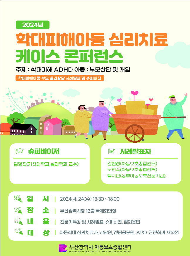행사는 ▲학대피해아동 부모 심리치료에 대한 전문가 특강 ▲학대피해아동 심리치료 및 부모상담 사례발표 ▲집중 슈퍼비전 순으로 진행될 예정이다.