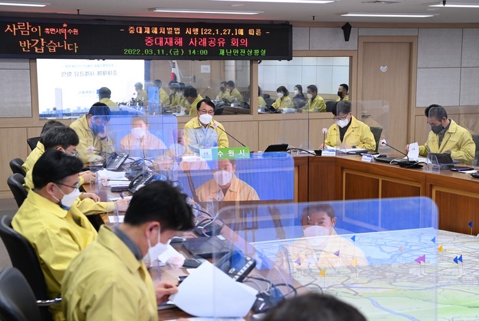 [로컬세계 김병민 기자]경기 수원시는 11일 시청 재난안전상황실에서 중대재해 사례공유 회의를 열고, 중대재해에 대응할 방안을 논의했다.