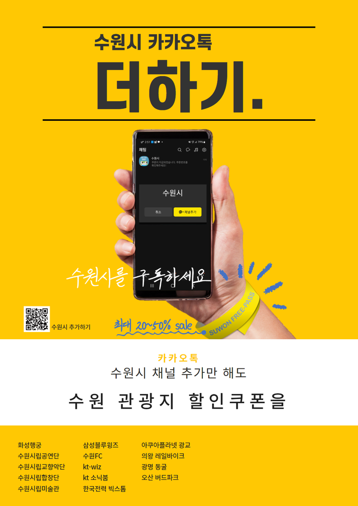 [로컬세계=김병민 기자]경기 수원시와 ‘카카오톡 플러스 친구’를 맺으면 다양한 무료·할인 혜택을 받을 수 있는 ‘수원시 카카오톡 더하기 이벤트’가 더 커진 혜택과 함께 돌아왔다.