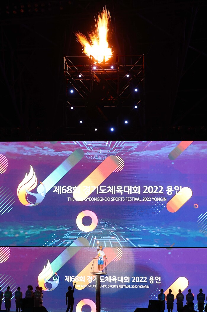 전날부터 이틀간 용인시 38개 읍면동을 순회한 성화는 4명의 주자와 함께 개회식장에 도착, 마지막 성화 봉송 주자로 나선 여홍철 경희대학교 교수(전 체조 국가대표 선수, 2022 경기도종합체육대회 홍보대사)가 성화 불꽃을 합쳐 무대에 마련된 화반으로 옮겼다.