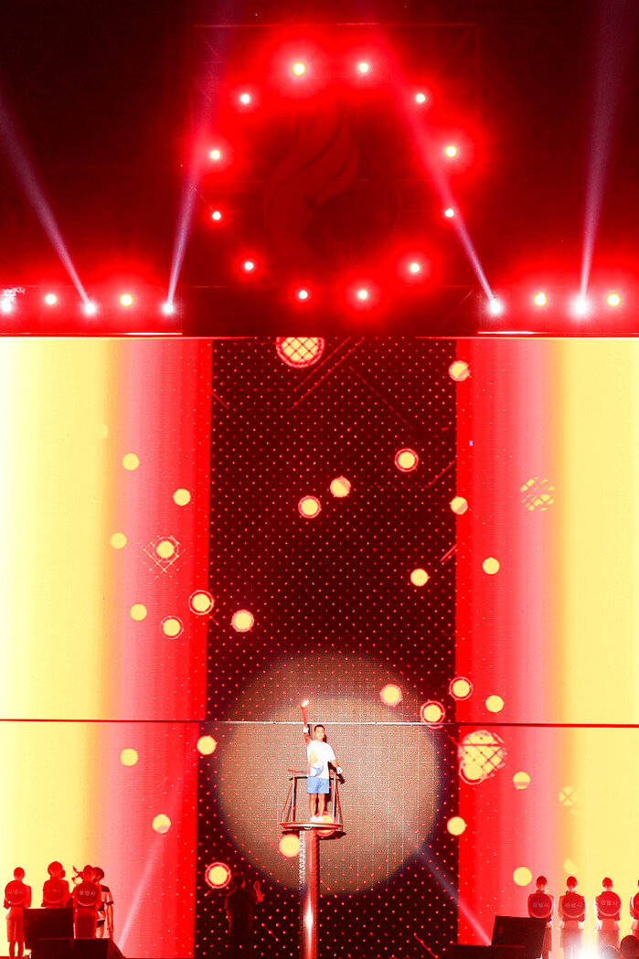 무대에 오른 여 교수가 화반에 점화하는 순간 성화를 담은 화반이 공중으로 떠올랐고, 불꽃은 로켓을 타고 개회식장 상공을 가르며 순식간에 성화대에 점화됐다.