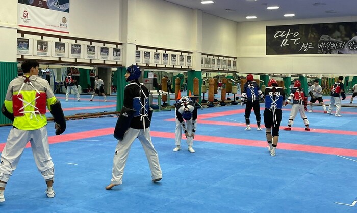 ▲용인시 직장운동경기부 태권도 선수들이 훈련을 하고 있다. 용인시 제공 |