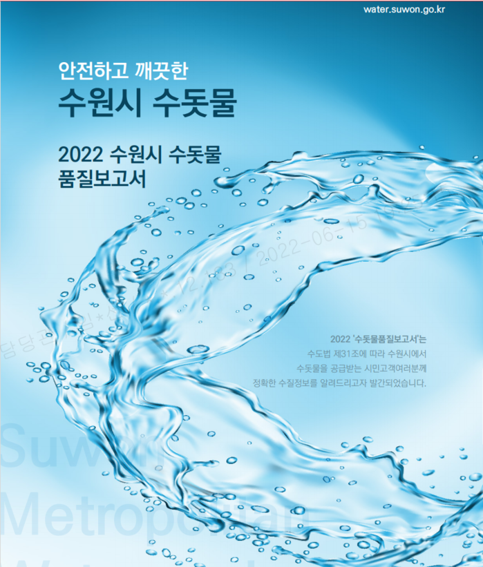 수원시상수도사업소가 2021년 수돗물 원·정수 수질 관리&결과, 수원시 상수도 시설 현황, 수돗물 생산·공급 과정, 수돗물 관련 상식, 알아두면 유익한 정보 등을 수록한 ‘2022 수돗물 품질보고서’를 제작했다.