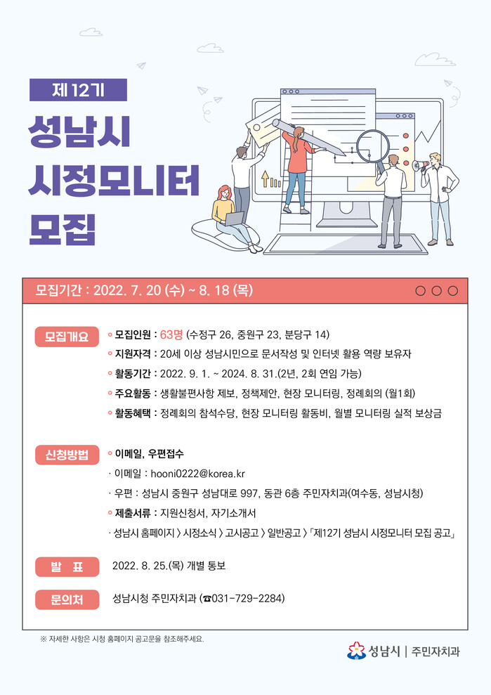 [로컬세계=김병민 기자]경기 성남시는 오는 8월 18일까지 ‘제12기 시정모니터’로 활동할 시민 63명을 모집한다고 26일 밝혔다.
