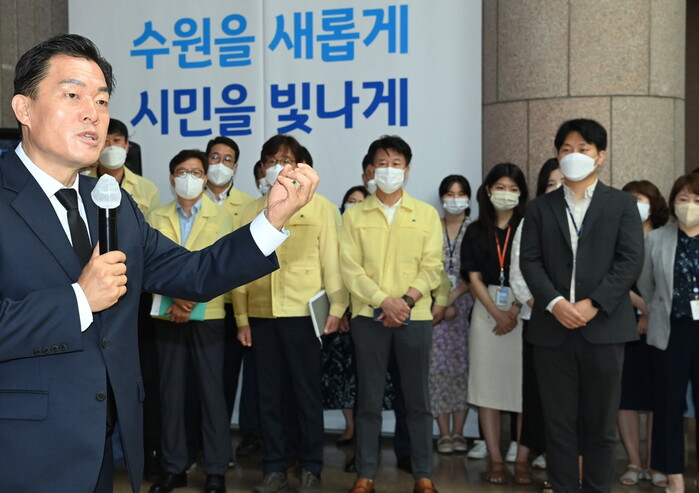 ▲지난 1일 수원시청으로 첫 출근을 한 이재준 수원특례시장이 ‘수원을 새롭게, 시민을 빛나게’라는 시정 구호 앞에서 수원시 공직자들에게 인사말을 하고 있다. 수원시 제공 |