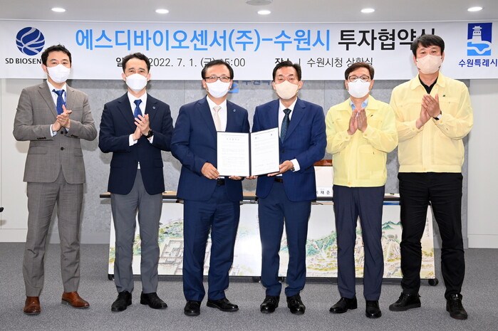 ▲이재준 수원특례시장(오른쪽 세 번째)이 지난 1일 첫 번째 투자협약을 맺은 SD바이오센서㈜ 관계자들과 기념촬영을 하고 있다. |
